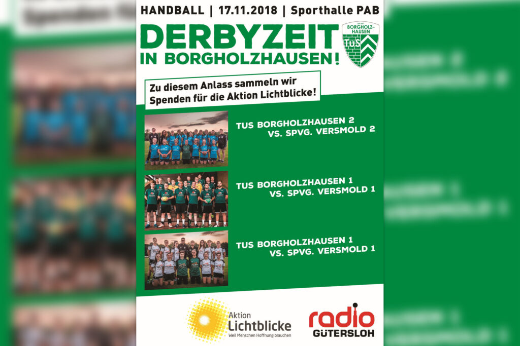 Die Handballabteilung freut sich am Samstag auf einen Heimspieltag mit gleich drei Derbys gegen die Spvg Versmold und hofft dabei auf zahlreiche Unterstützung von der Tribüne. Der erste Anpfiff erfolgt um 15.45 mit dem Spiel der 2. Damen in der Kreisliga, um 17.30 Uhr folgt die 1. Herren, den Abschluss bilden die 1. Damen um 19.15 Uhr. Den ganzen Tag über werden Spenden für die „Aktion Lichtblicke“ gesammelt!
